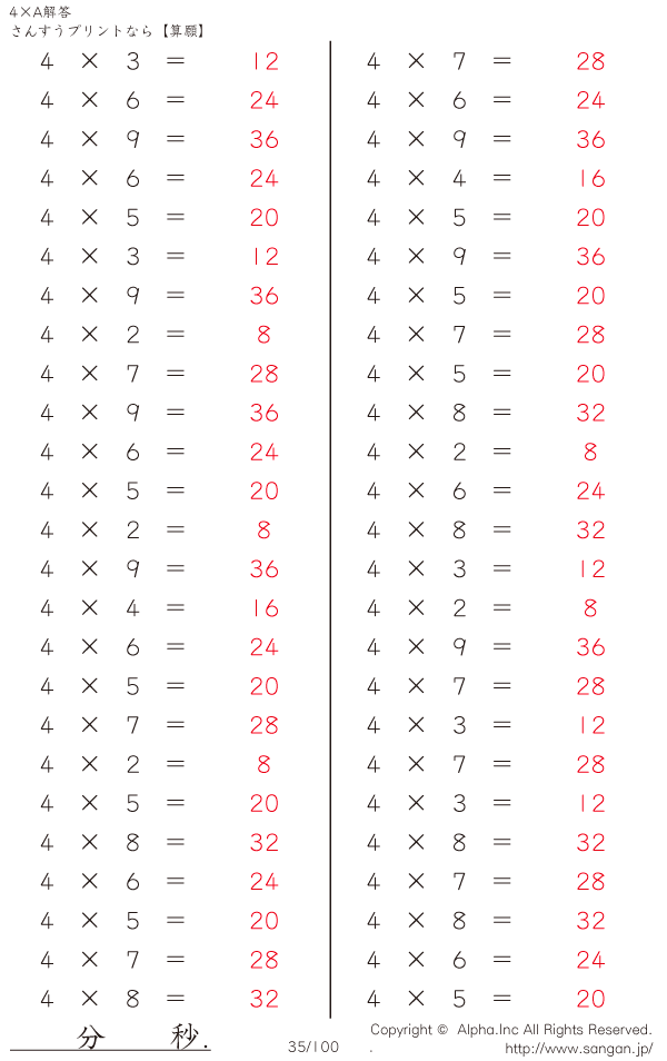 算数計算問題 4×AのPDFプリント [解答]035/100