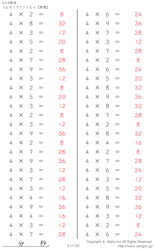 算数計算問題 4×AのPDFプリント [解答]041/100