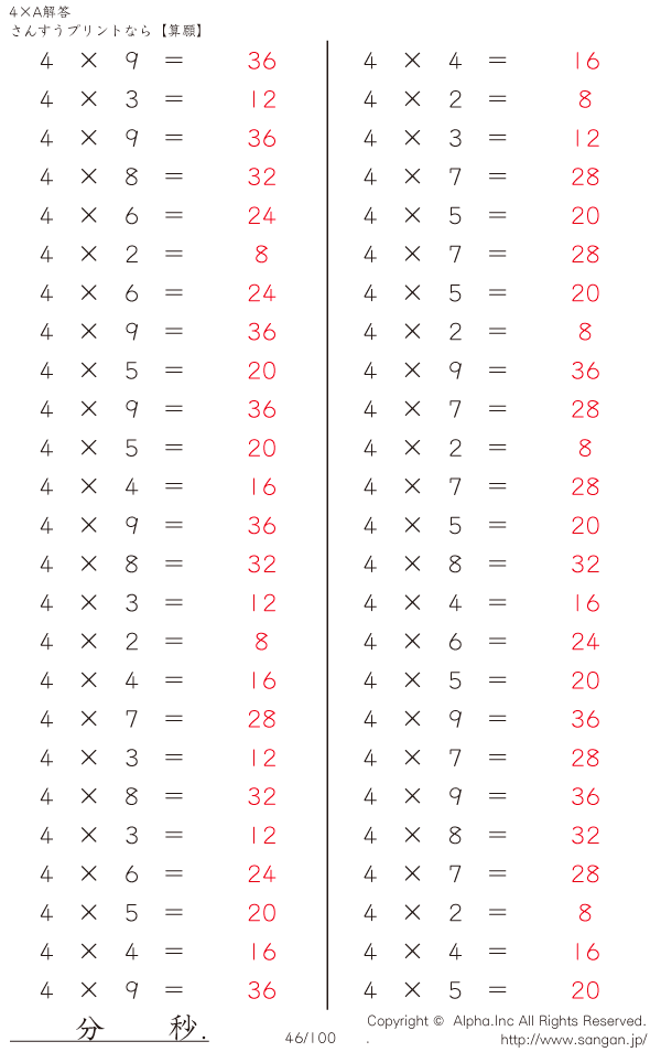 算数計算問題 4×AのPDFプリント [解答]046/100