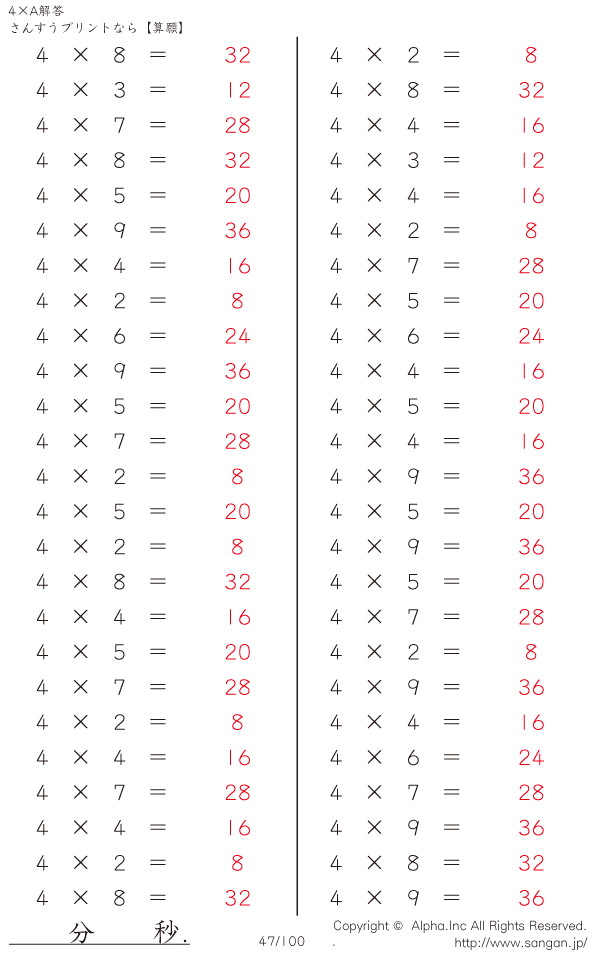 算数計算問題 4×AのPDFプリント [解答]047/100