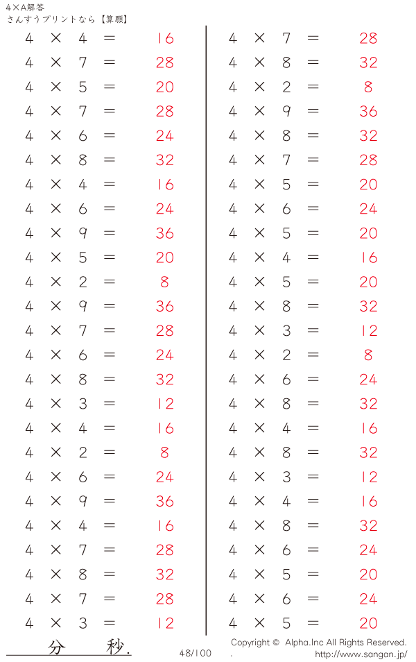 算数計算問題 4×AのPDFプリント [解答]048/100