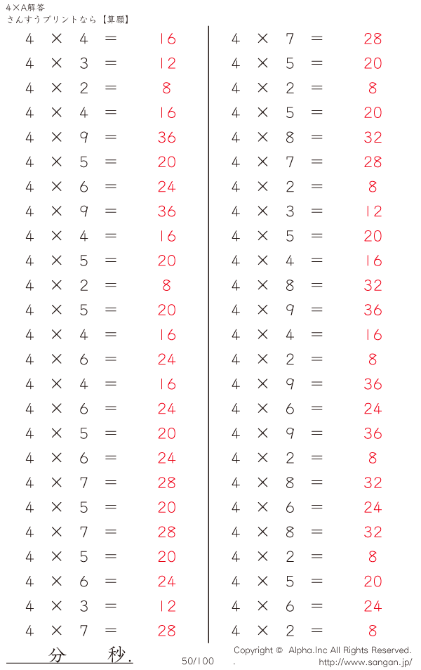算数計算問題 4×AのPDFプリント [解答]050/100
