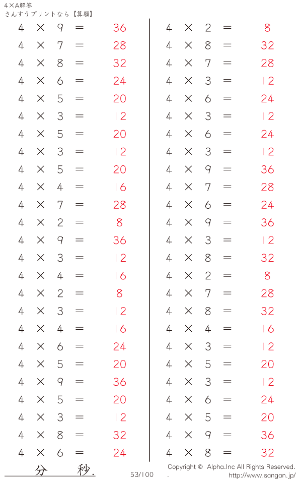 算数計算問題 4×AのPDFプリント [解答]053/100