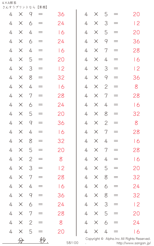 算数計算問題 4×AのPDFプリント [解答]058/100