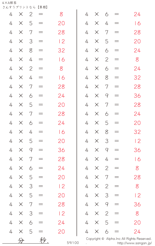 算数計算問題 4×AのPDFプリント [解答]059/100