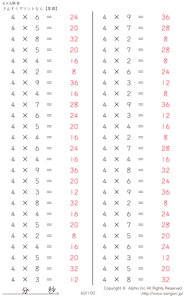 算数計算問題 4×AのPDFプリント [解答]060/100