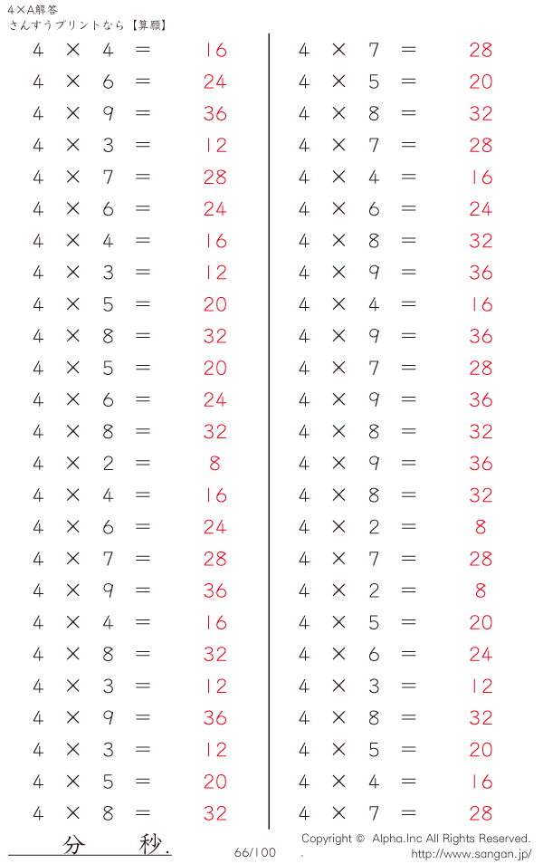 算数計算問題 4×AのPDFプリント [解答]066/100