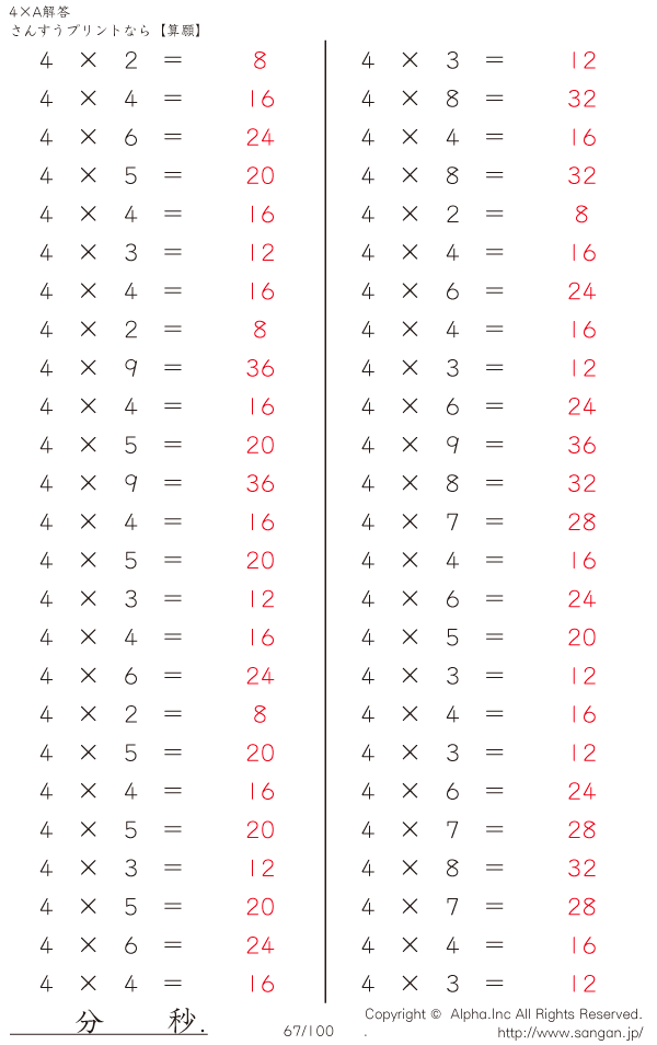 算数計算問題 4×AのPDFプリント [解答]067/100