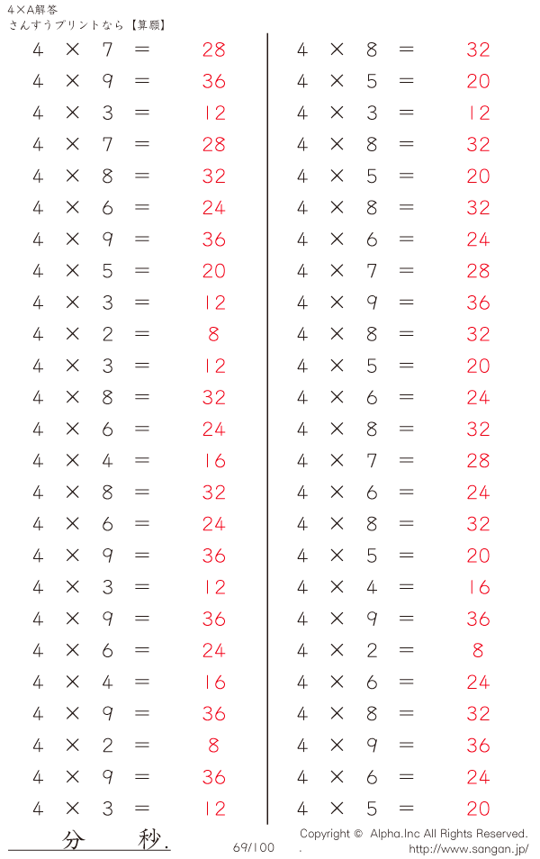 算数計算問題 4×AのPDFプリント [解答]069/100