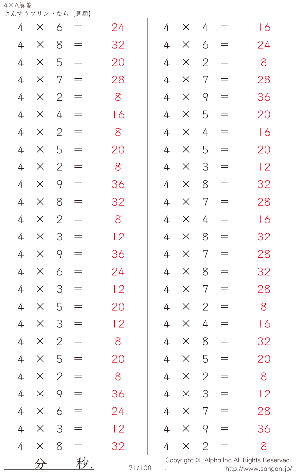 算数計算問題 4×AのPDFプリント [解答]071/100