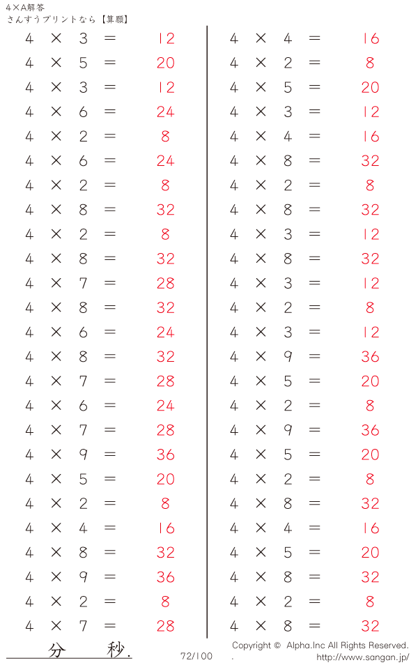 算数計算問題 4×AのPDFプリント [解答]072/100