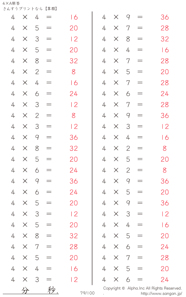 算数計算問題 4×AのPDFプリント [解答]079/100