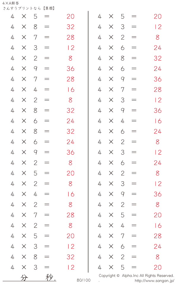 算数計算問題 4×AのPDFプリント [解答]080/100