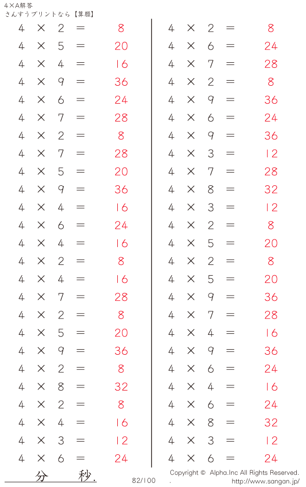 算数計算問題 4×AのPDFプリント [解答]082/100
