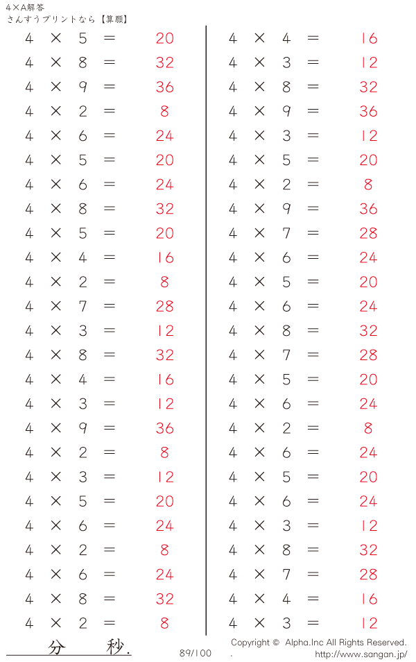 算数計算問題 4×AのPDFプリント [解答]089/100