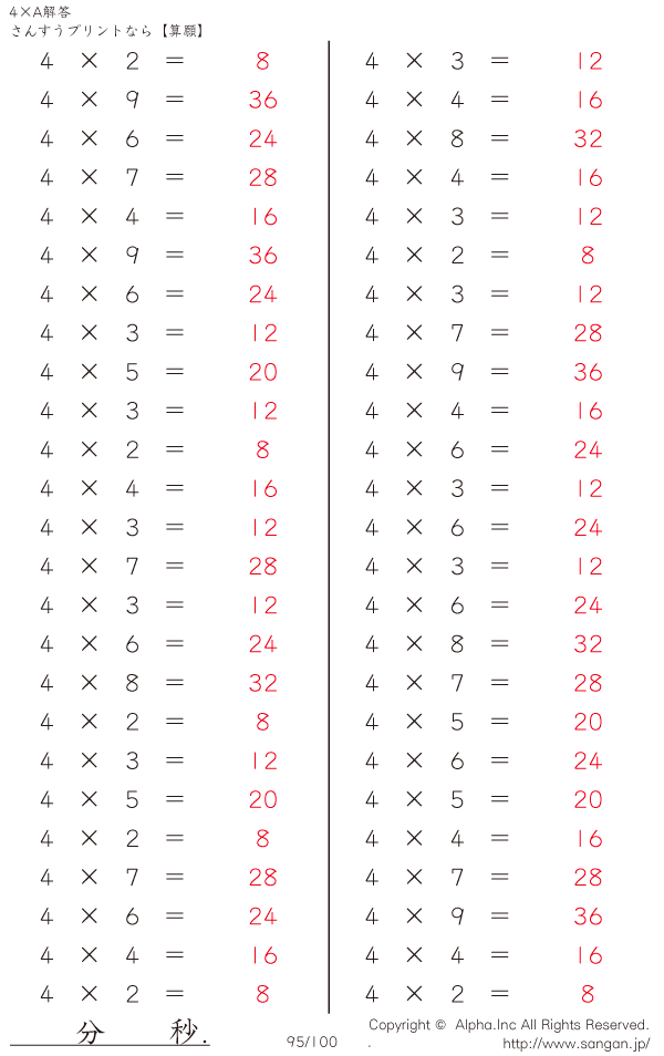 算数計算問題 4×AのPDFプリント [解答]095/100
