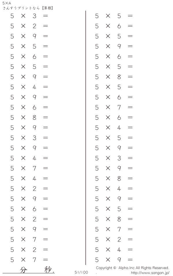 算数計算問題 5×AのPDFプリント [問題]051/100