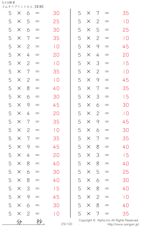 算数計算問題 5×AのPDFプリント [解答]025/100
