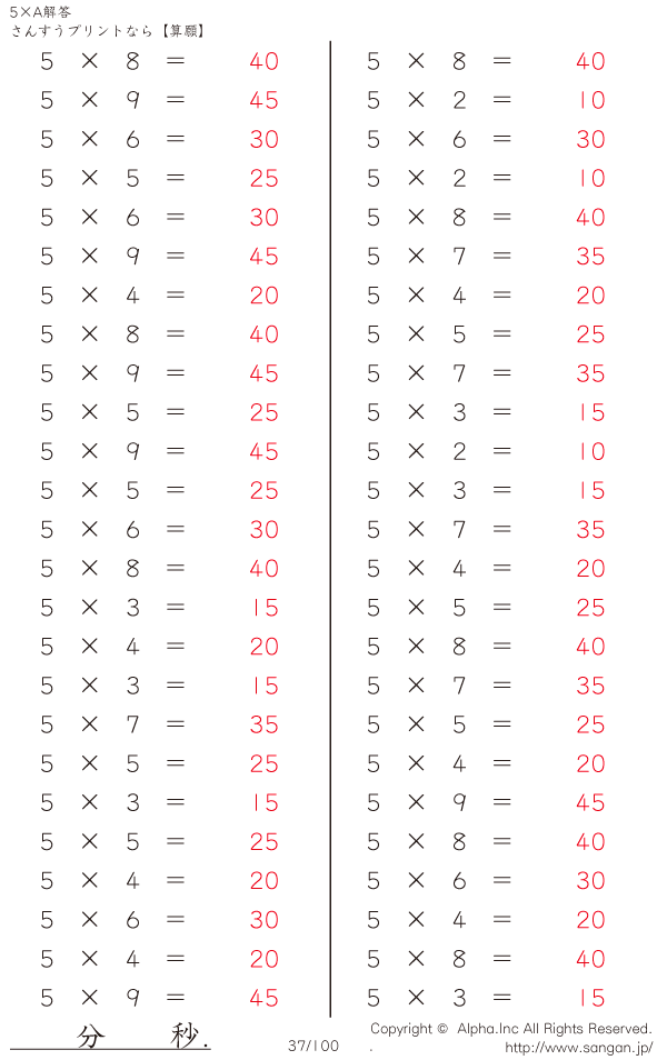 算数計算問題 5×AのPDFプリント [解答]037/100