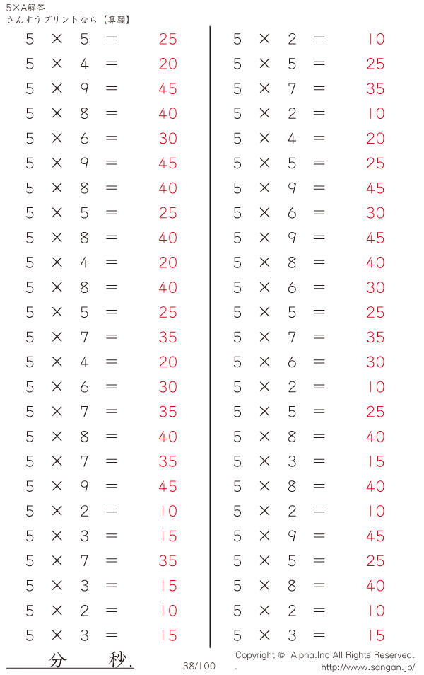 算数計算問題 5×AのPDFプリント [解答]038/100