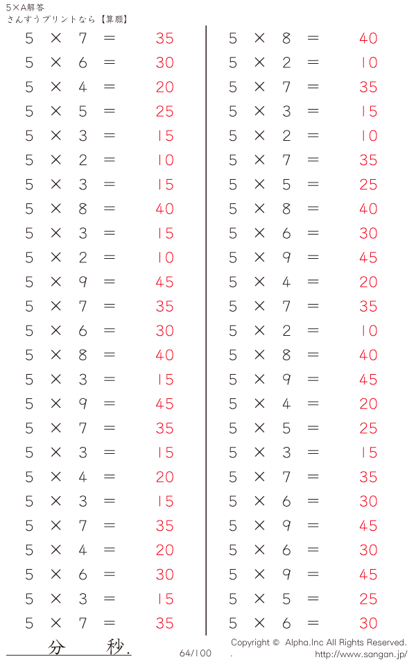 算数計算問題 5×AのPDFプリント [解答]064/100