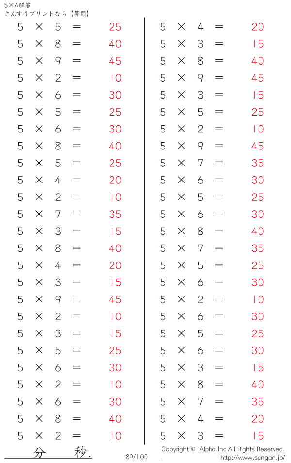 算数計算問題 5×AのPDFプリント [解答]089/100