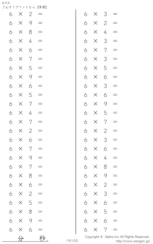 算数計算問題 6×AのPDFプリント [問題]019/100