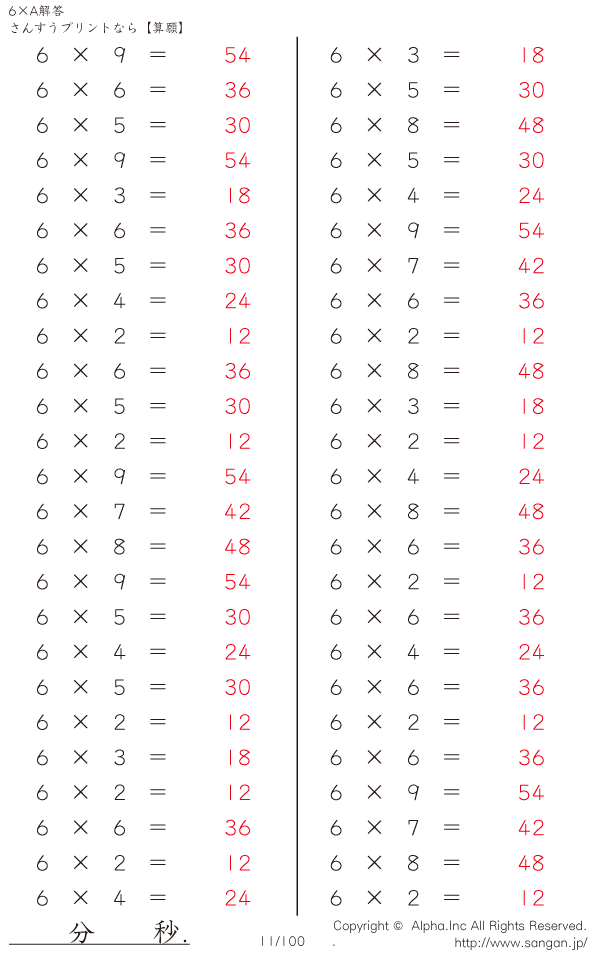 算数計算問題 6×AのPDFプリント [解答]011/100