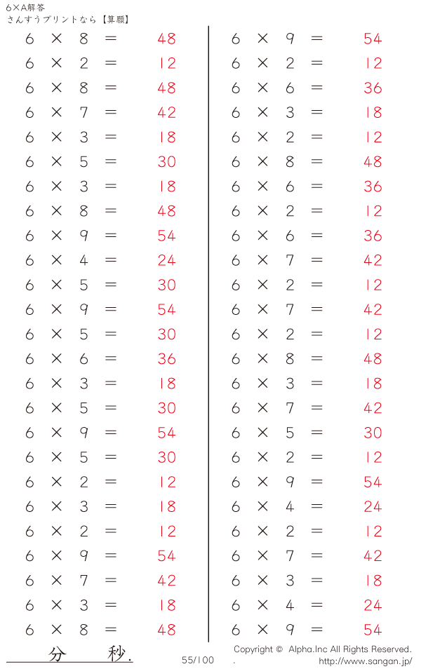 算数計算問題 6×AのPDFプリント [解答]055/100