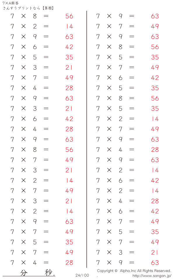算数計算問題 7×AのPDFプリント [解答]024/100