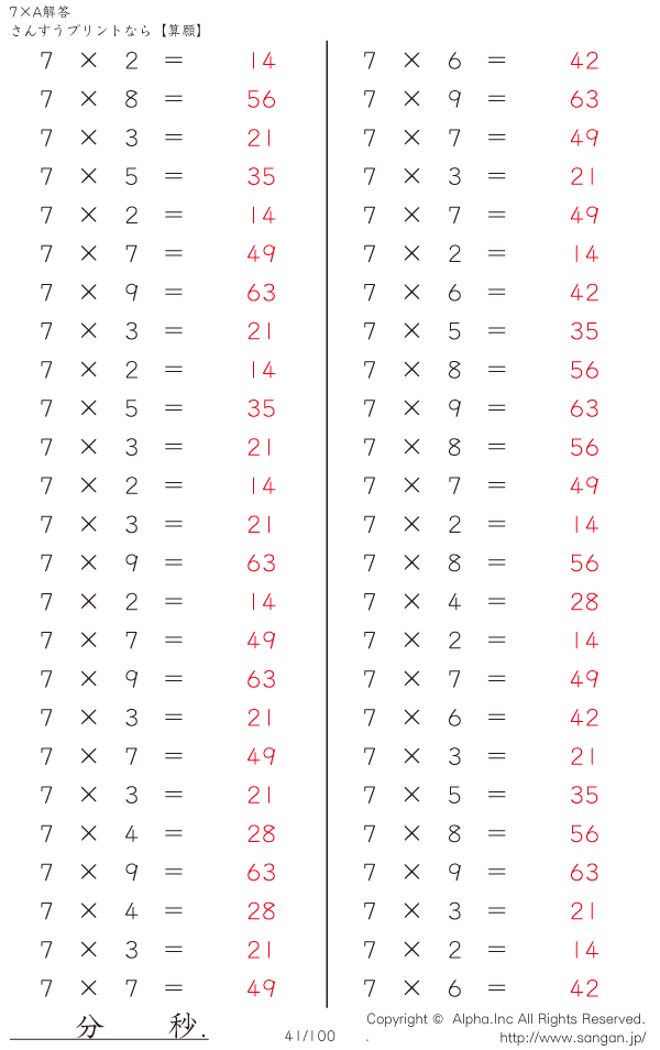 算数計算問題 7×AのPDFプリント [解答]041/100