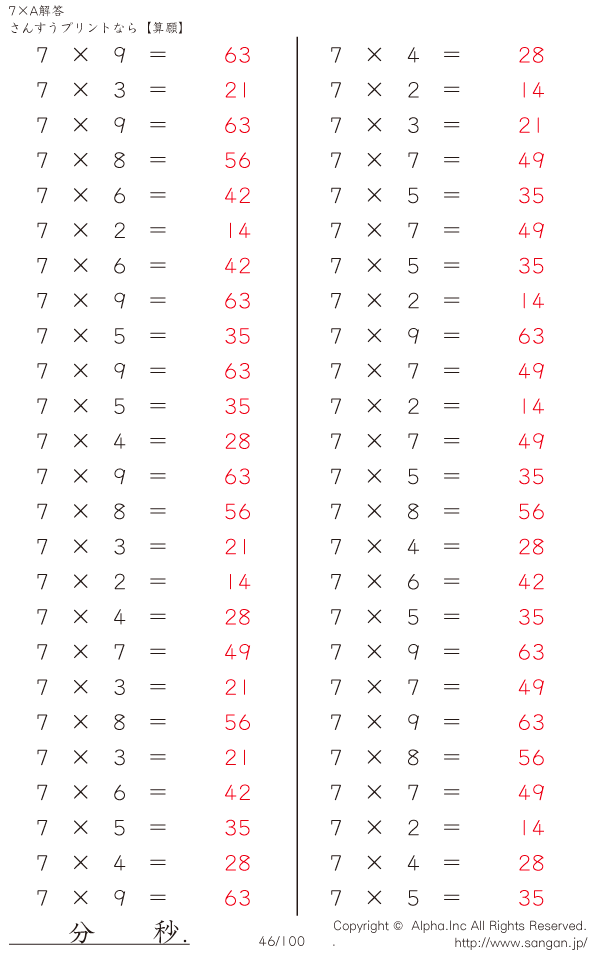 算数計算問題 7×AのPDFプリント [解答]046/100