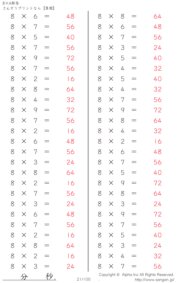 算数計算問題 8×AのPDFプリント [解答]021/100