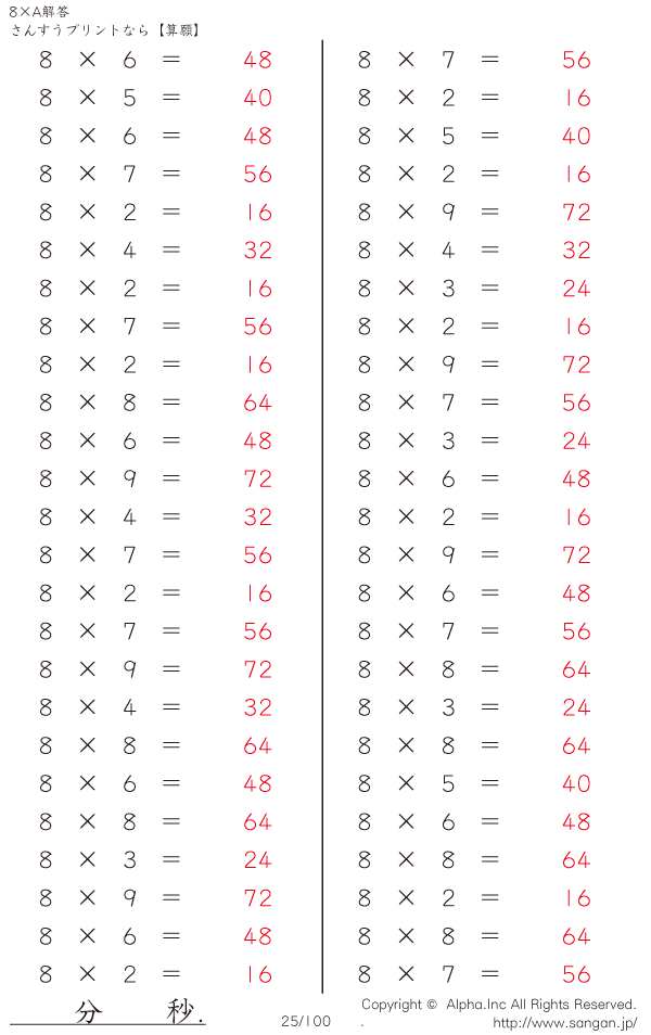 算数計算問題 8×AのPDFプリント [解答]025/100