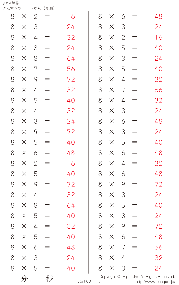 算数計算問題 8×AのPDFプリント [解答]056/100