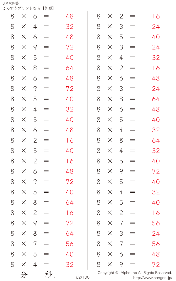 算数計算問題 8×AのPDFプリント [解答]062/100