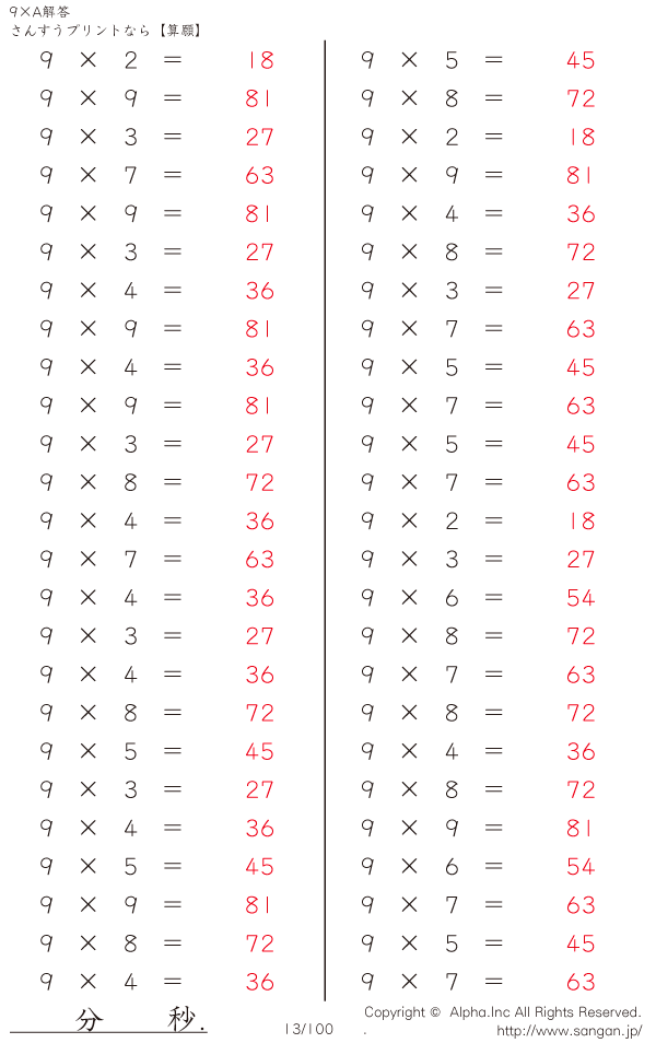 算数計算問題 9×AのPDFプリント [解答]013/100