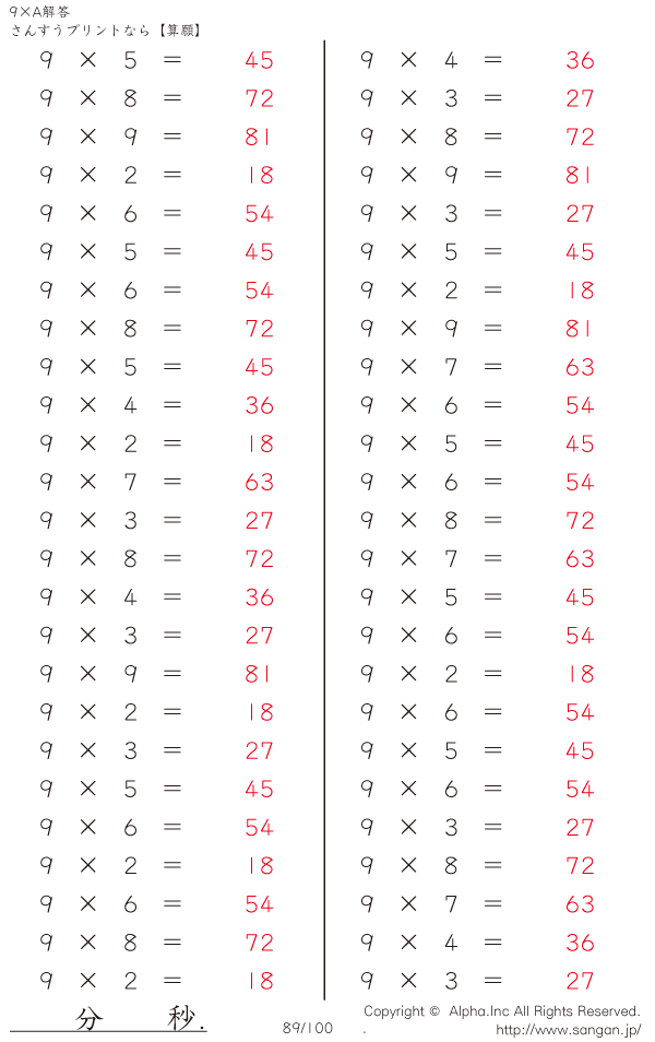 算数計算問題 9×AのPDFプリント [解答]089/100