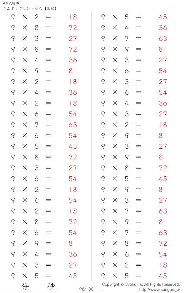 算数計算問題 9×AのPDFプリント [解答]098/100