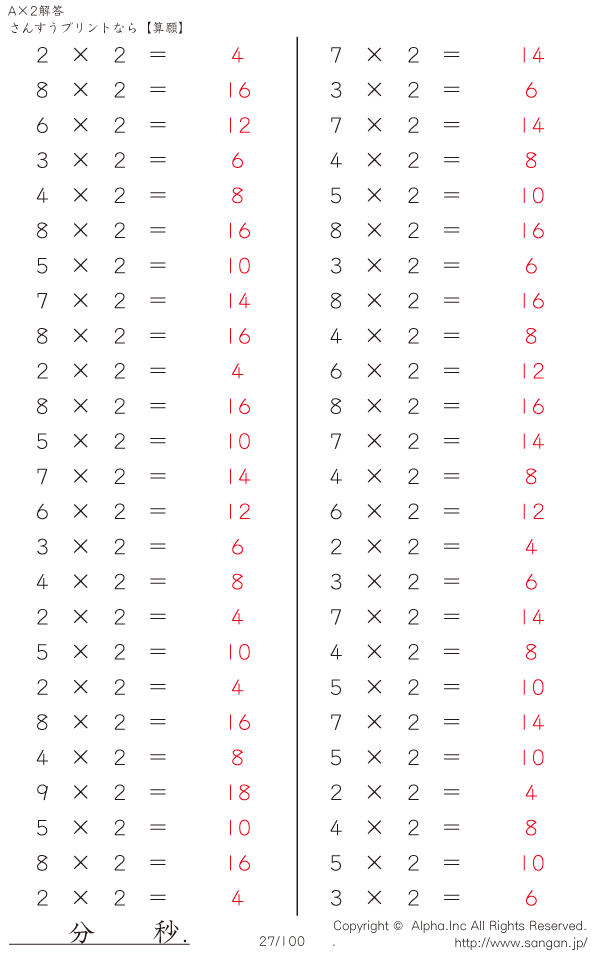 算数計算問題 A×2のPDFプリント [解答]027/100