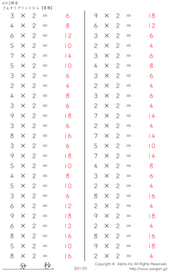 算数計算問題 A×2のPDFプリント [解答]030/100