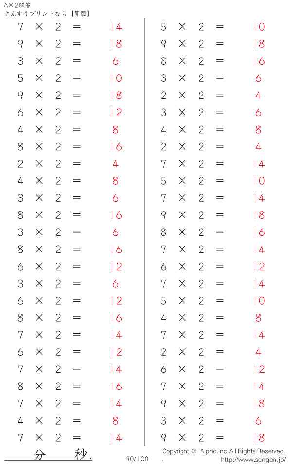 算数計算問題 A×2のPDFプリント [解答]090/100