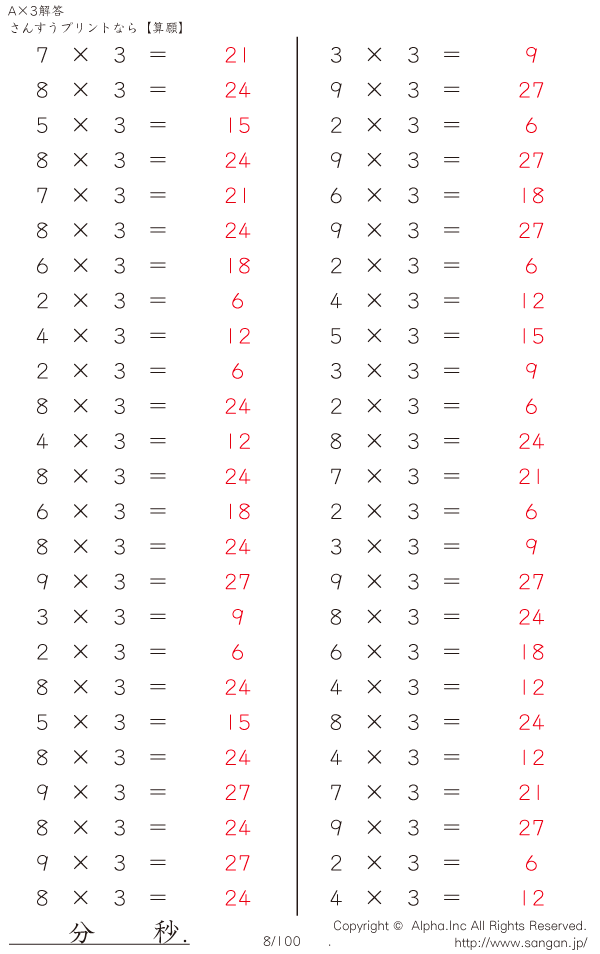 算数計算問題 A×3のPDFプリント [解答]008/100