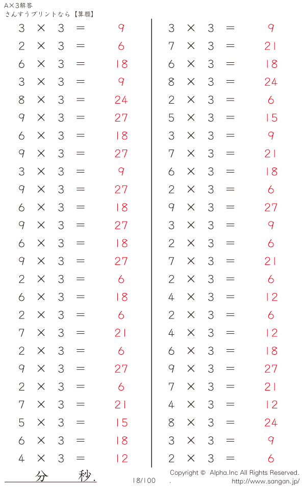 算数計算問題 A×3のPDFプリント [解答]018/100