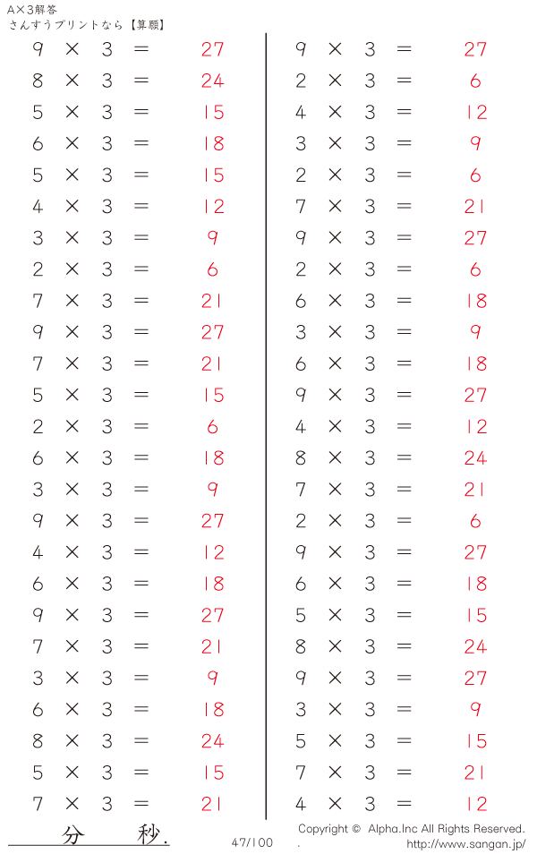 算数計算問題 A×3のPDFプリント [解答]047/100