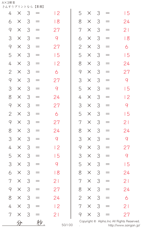 算数計算問題 A×3のPDFプリント [解答]050/100