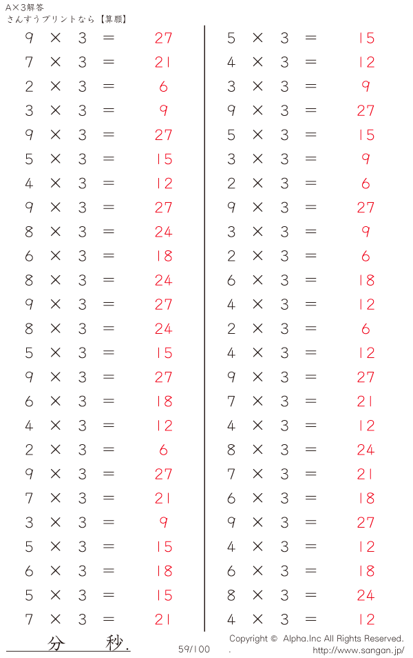 算数計算問題 A×3のPDFプリント [解答]059/100