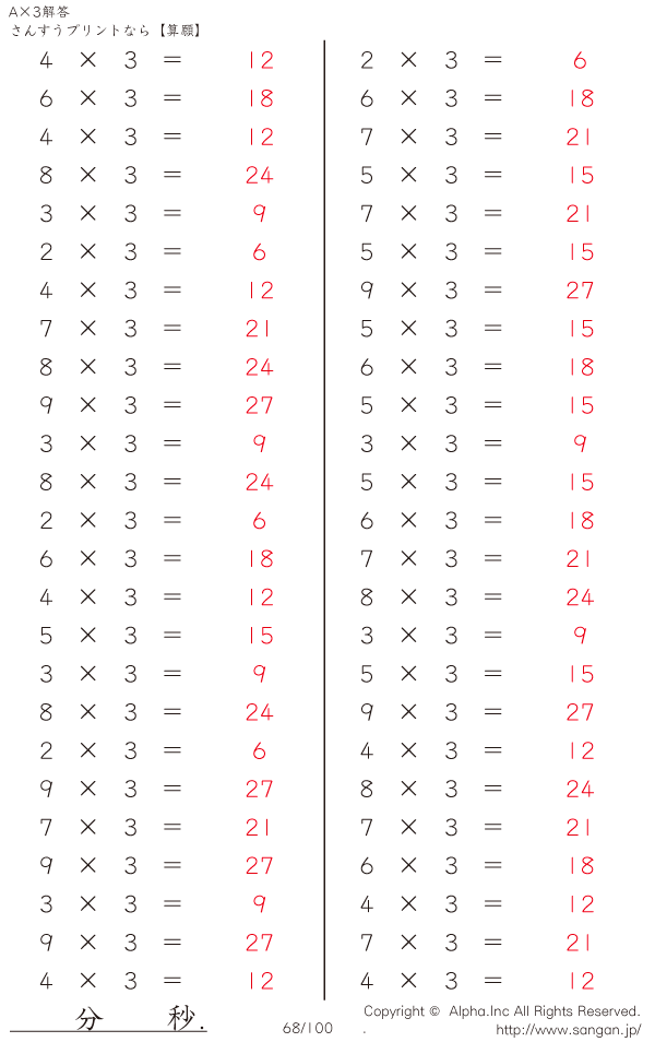 算数計算問題 A×3のPDFプリント [解答]068/100
