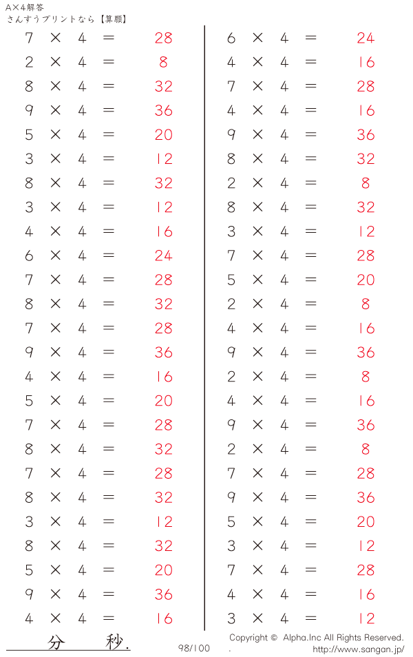 算数計算問題 A×4のPDFプリント [解答]098/100