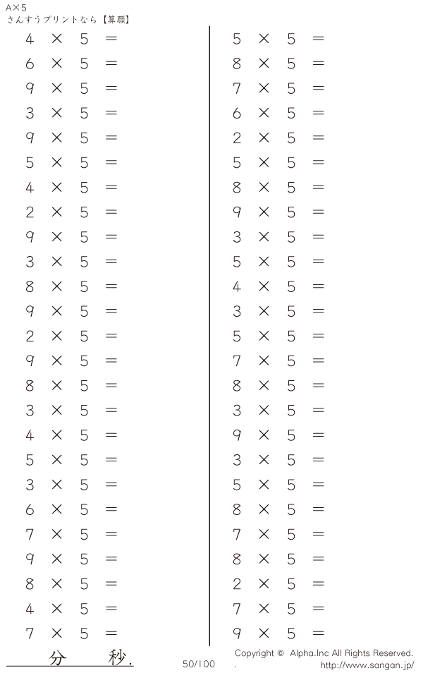 算数計算問題 A×5のPDFプリント [問題]050/100